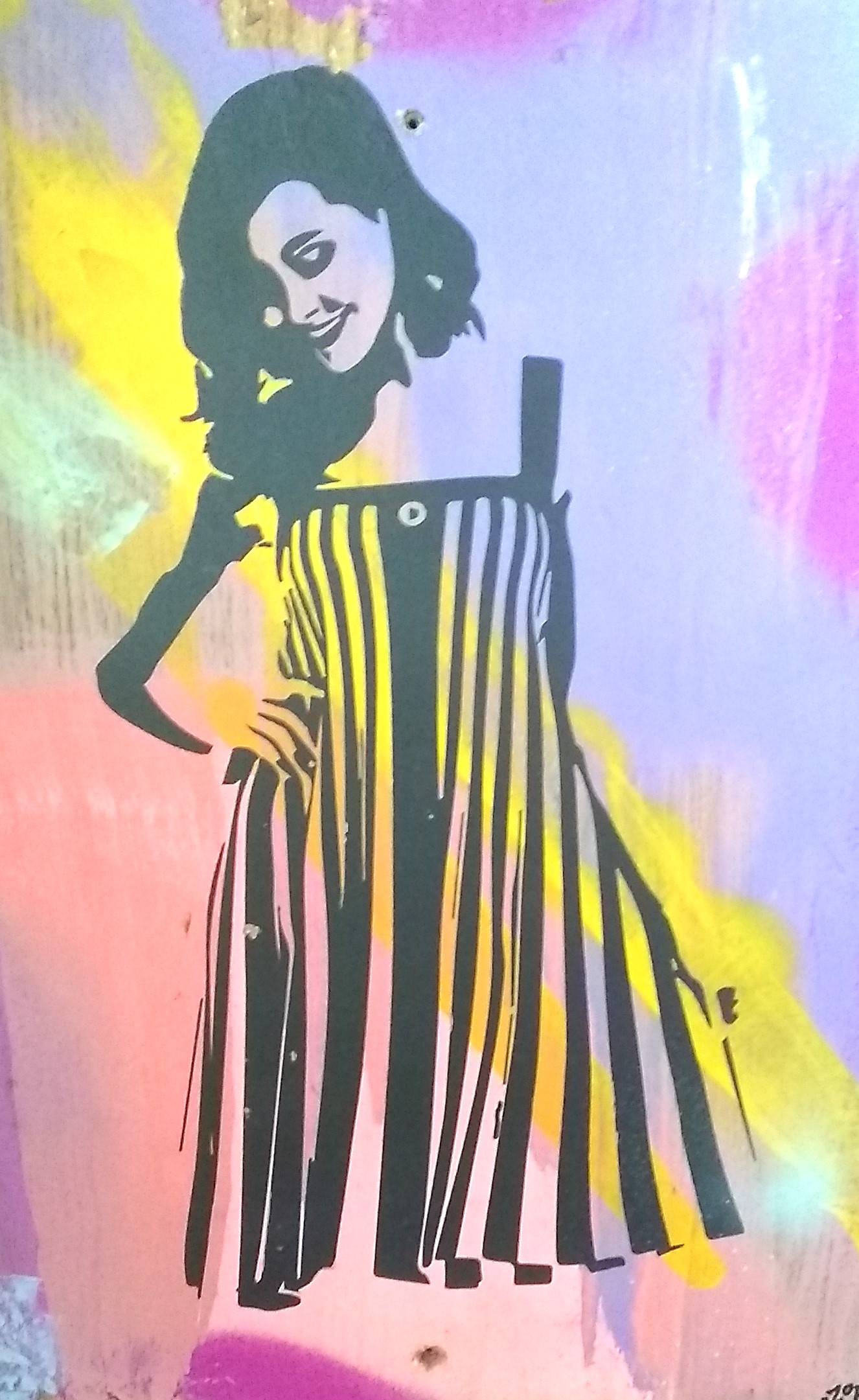 I wanted this black stencil of a woman wearing a striped dress painted over a watercolor background on a piece of 10”x 20” piece of particleboard that had seen earlier life as a piece of furniture or cabinetry. The application of the stencil had been perfectly executed—no drips or splotches.