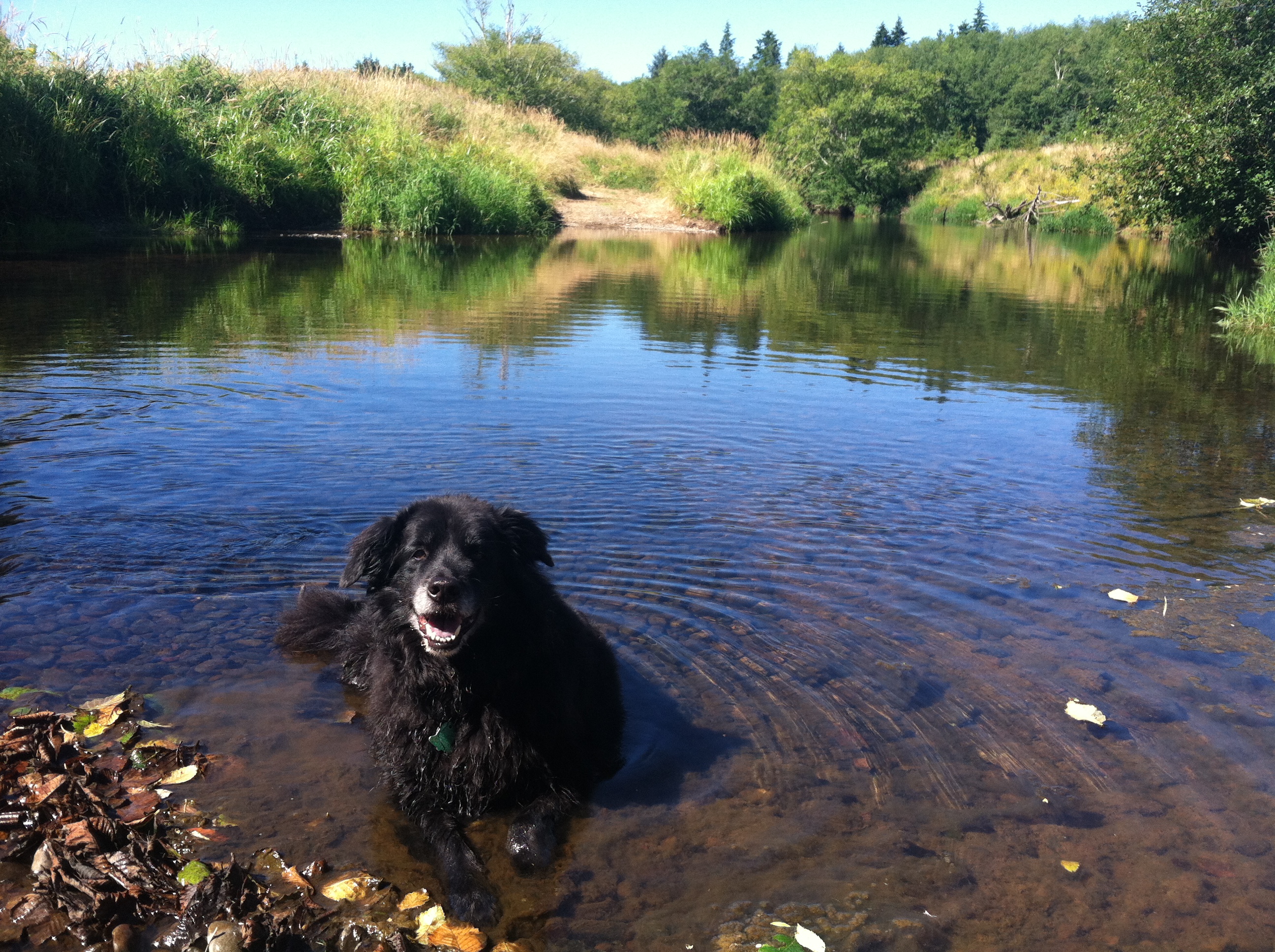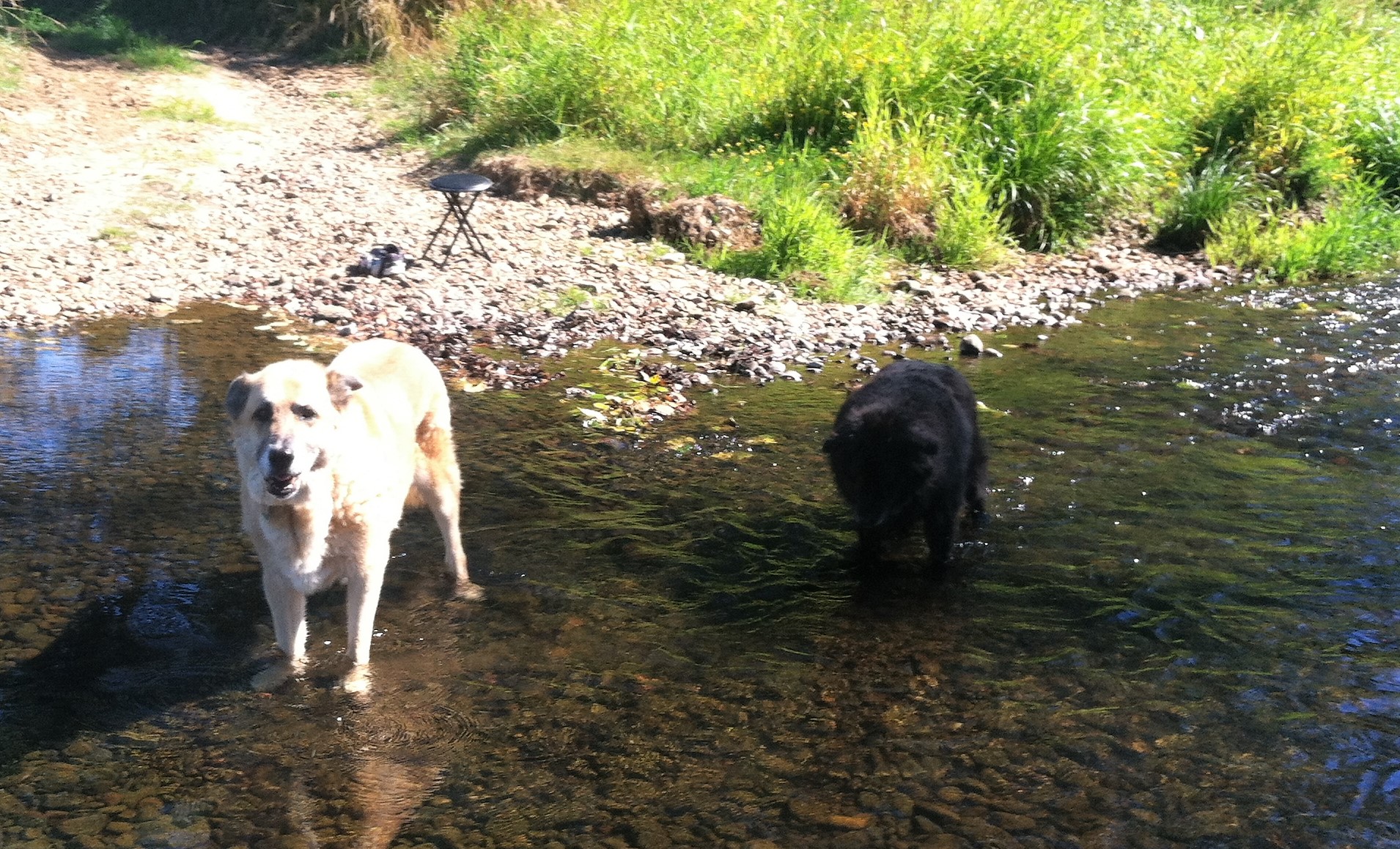 I heard some splashing and looked around. Bonnie had flopped down in the middle of the river and stared straight at me. Clyde had retired to the bank and was snoozing in the tall grass.